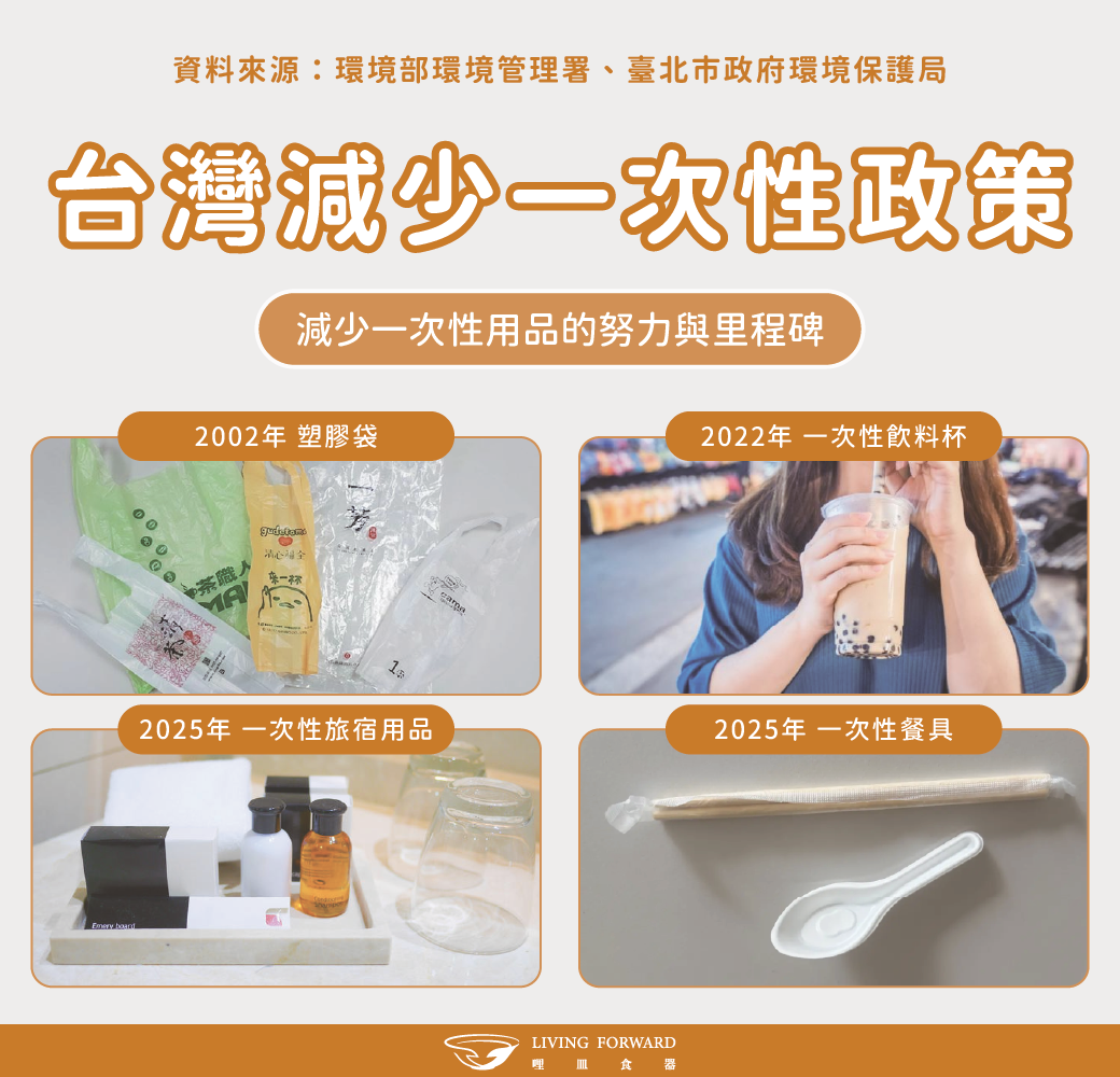 這些年,台灣正一步步戒掉「一次性」的習慣, ➊ 2002年:塑膠袋限制使用政策 開始不主動提供塑膠袋,並逐步收取費用,從此環保袋成為生活中的必備,也多了環保新選擇。 台北市率先規定不得提供一次用飲料塑膠杯,手搖杯族也慢慢養成自備杯的習慣,既省錢又環保,還多了一點生活品味。 ➌ 2025年:一次性旅宿用品限制政策 旅宿業不再主動提供一次性備品,牙刷、梳子、刮鬍刀等改由旅客自行準備,旅行,也變得更貼近永續的精神。 ➍ 2025年:一次性餐具收費政策 部分場所針對一次性餐具進行收費,外食族們開始準備好自己的環保餐具,一起努力減少一次性的產品。