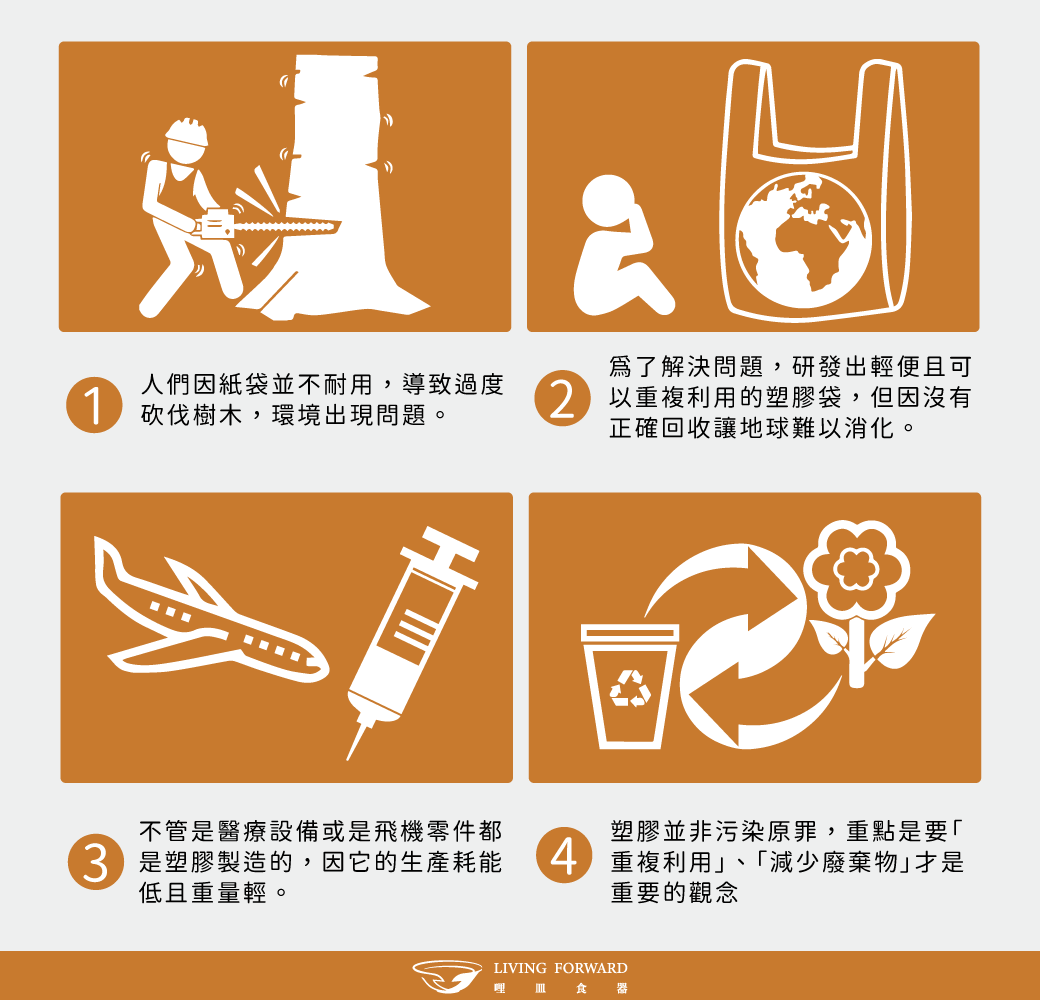 塑膠袋產生的本意是讓人們可以重複使用,並非是利用完即丟,其實塑膠用在對的地方上,不僅可減少石化新料產生,比起金屬、陶瓷、玻璃等材質更加輕盈且方便回收再製造,解決塑膠困境最全面且更為務實行動方案,就是「減少廢棄物、重複再利用」。其中包裝、食物容器與餐具是重複利用最快速可改變的地方。