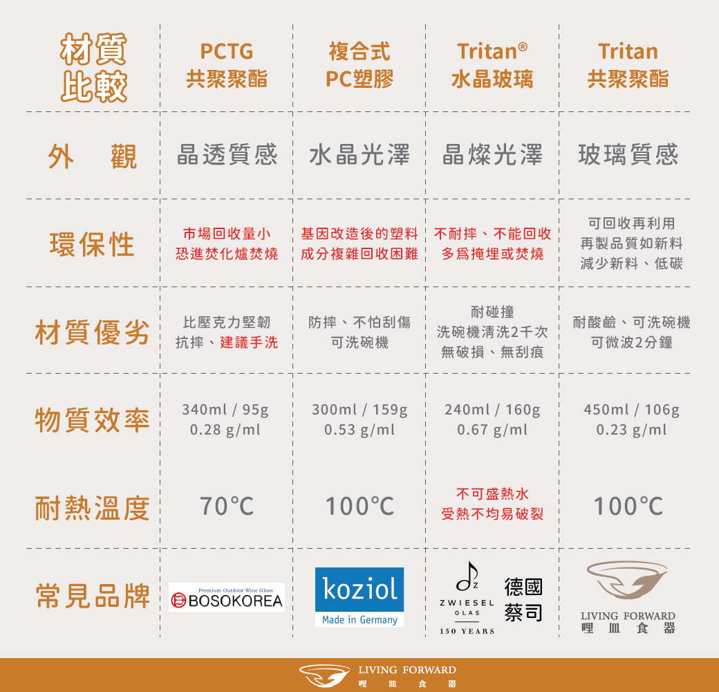強化結構美學邊界│Tritan®水晶玻璃 透過添加「鈦、鋯」元素提升結構硬度,在維持玻璃清透觸感的同時,增加耐碰撞與洗碗機清洗的壽命。但需注意其本質仍具脆性,受熱不均時有破裂風險。 綜合評估最優的理性方案。不僅徹底終結破碎風險,更具備可微波 2 分鐘的強大機能與無 BPA 的安全性,是兼顧健康與多工生活的首選。 針對極致輕量化或高頻率社交市場所設計,在重量負荷與防摔性能間取得平衡。PCTG僅95g的輕盈感;而改性PC則是消除了雙酚A的疑慮,在維持極致耐刮能力與玻璃光澤的同時,提供更安心的使用體驗。